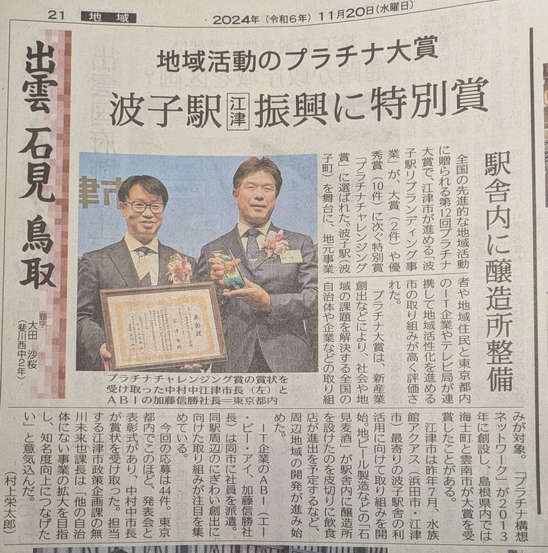 江津市の波子駅振興に地域活動のプラチナ大賞の特別賞を受賞した。と。
