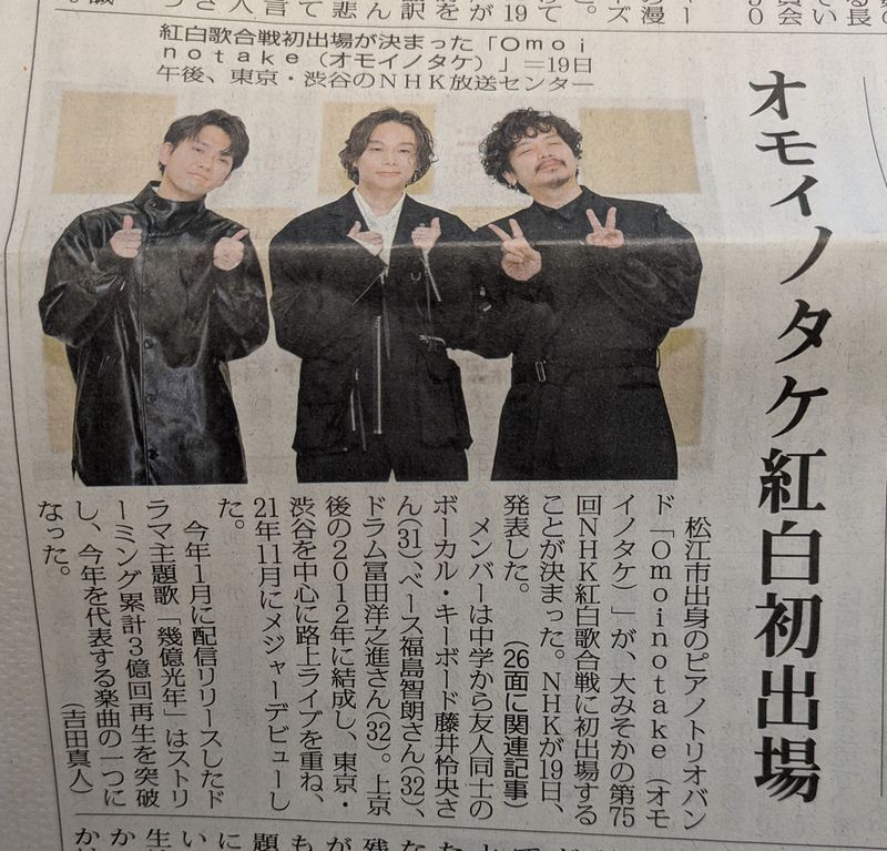 昨日、紅白歌合戦の出場者が判らなくなった。との感想を書きましたが、何と今回初出場の中に、島根県の松江市で活動している「オモイノホカ」の3人組が選ばれた様です。