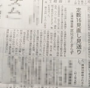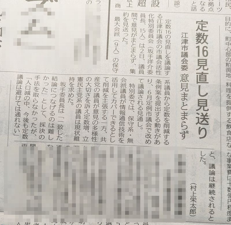 保守系・無会派議員が情報通信技術を活用して定数削減はカバー出来るとしているのに対して、共産系議員は定数増、立憲民主党系議員は現状維持を主張している様で、お預け状態になった様です。