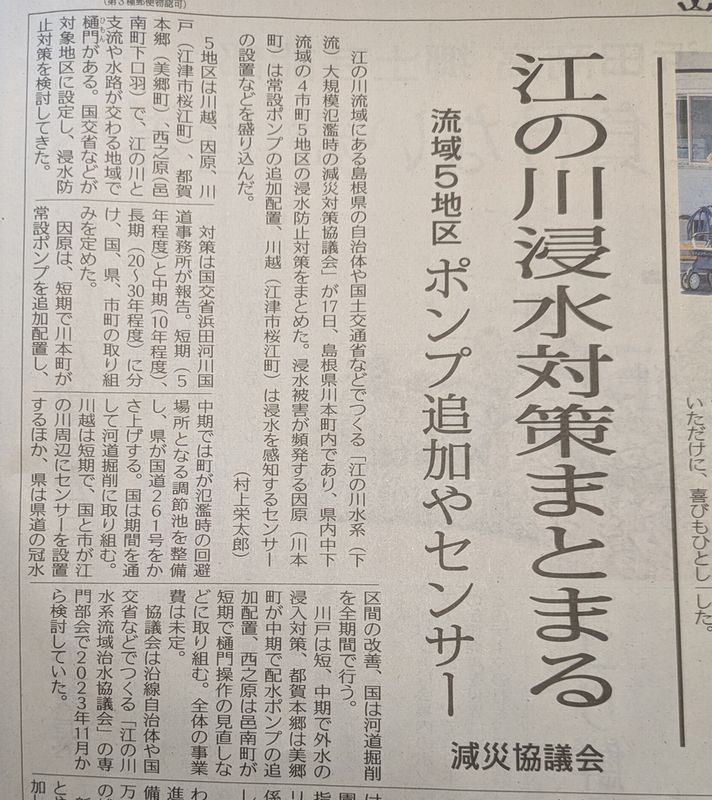 その水害時期を前に、江の川浸水対策が纏まるとの記事がありました。