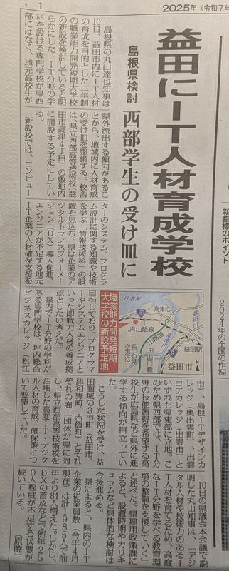 益田市(島根県の西端)に、IT人材育成を目的とした職業能力開発短期大学校の新設を検討している。と。