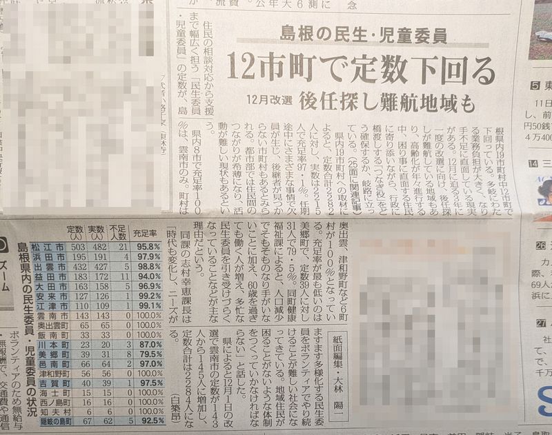 島根県内の民生委員の充足率の記事がありました。