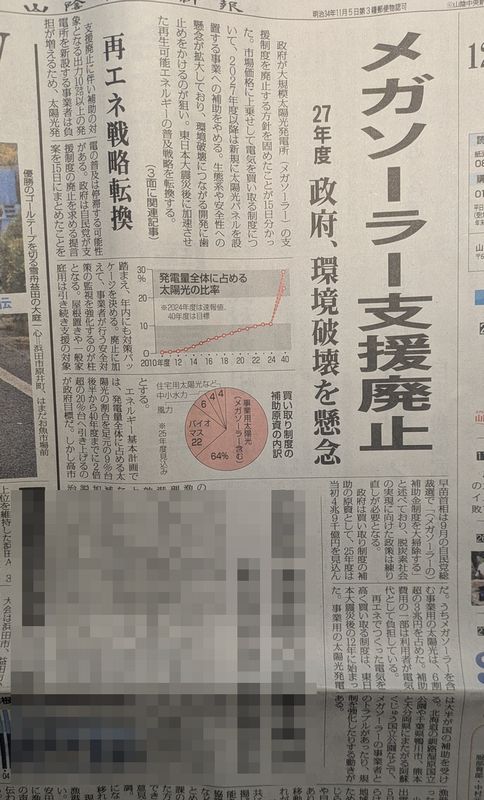 ただし、現在の全電力の発電種別の発電割合で、2040年度代にソーラー割合を20%にする事の目標はそのままの様ですが・・・?