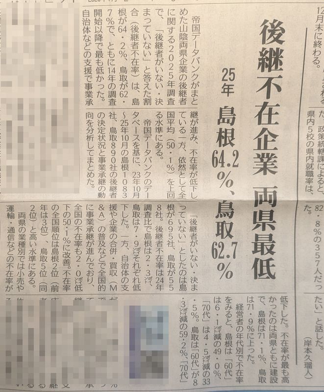 以前から言われていましたが、島根県の地元企業の後継者不在が、ますます顕著化している様です。