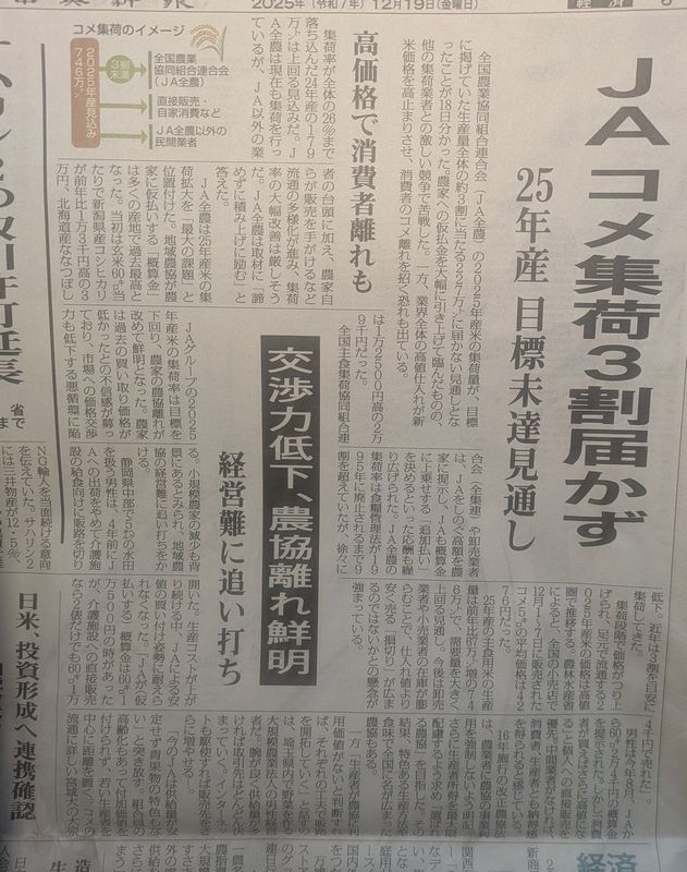 今朝の新聞には、「JAがコメの集荷量が生産量の3割を目標にしていたが、目標に届かない。」との記事がありました。