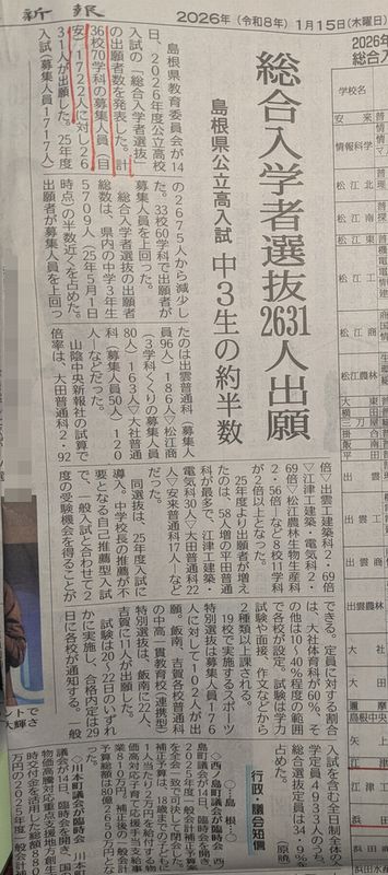この試験を受験する予定の中学3年生に出会い、少し話していると「浜田高校(わが母校)の受験で、1.5倍ぐらいです。ダメだったら、次の一般入試を受けないといけないんです。」と。