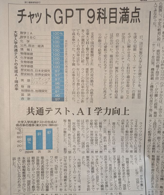 17、18日実施の大学入学共通テストを、対話型生成人工知能(AI)「チャットGPT」の最新モデルに解かせると、9科目で満点を取った。と。