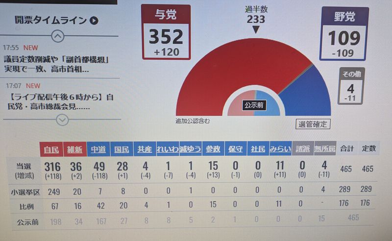 第51回衆院選は8日投開票された。自民党が定数465の3分の2を超える316議席を獲得。と。