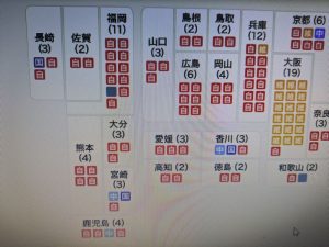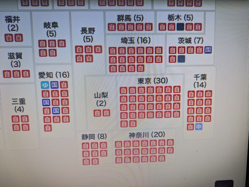 大阪の維新の黄色が多いですが、他はほぼ赤。