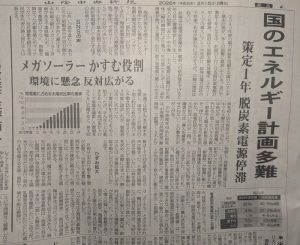 政府は、大規模太陽光発電所の導入にブレーキをかけ、原発は電力会社の不祥事で利用が頭打ちになりそうだ。と。