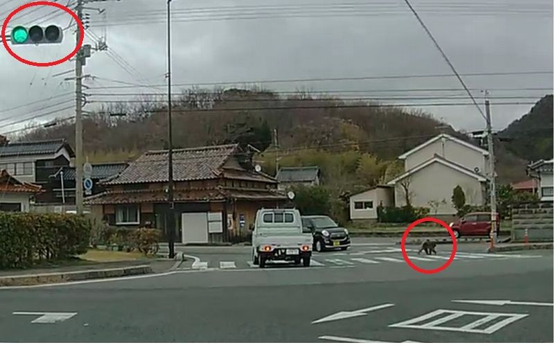 残念ながら、サルの渡っている側は、赤信号ですけど・・・。