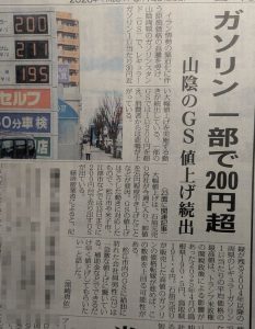 昨日の新聞記事にガソリン価格値上げのニュースが・・・。